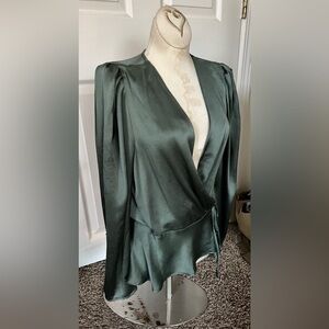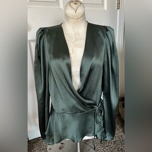 Elegant wrap top with a deep V-neck. Features long sleeves and a tie waist. Perfect for a chic look.