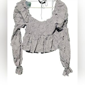 Chic light blue blouse with eyelet design. Features puff sleeves and front tie detail. Ideal for a trendy look.