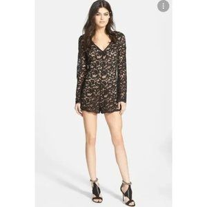 A plunging double-V neckline sets off an ultra-flirty scalloped lace romper flanked by sheer long sleeves.