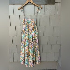 Vibrant floral midi dress. Features adjustable straps. Perfect for summer outings.