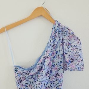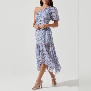 Elegant one shoulder dress by Astr. Features a floral pattern. Perfect for special occasions.