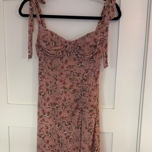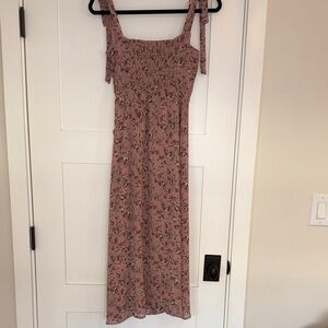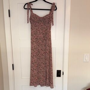 Charming pink midi dress with floral pattern. Features tie straps and a fitted bodice. Ideal for casual outings.
