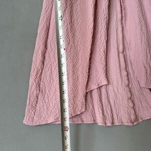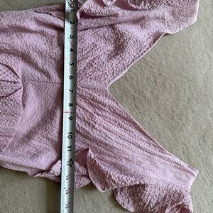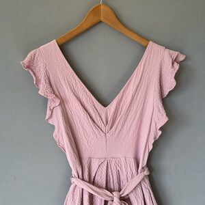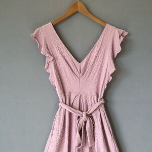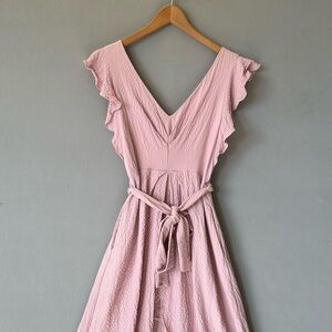 Elegant pink midi dress. Features ruffle sleeves and a tie waist. Perfect for any occasion.
