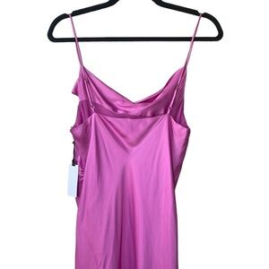 Elegant pink satin mini dress. Features a draped neckline and slim straps. Perfect for a night out.