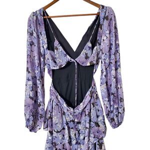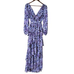 Elegant purple floral maxi dress. Features long sleeves and tiered skirt. Perfect for special occasions.