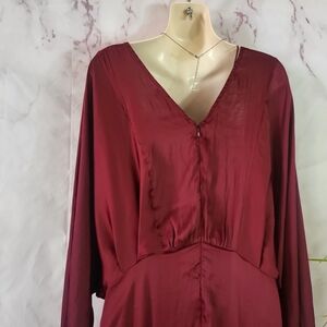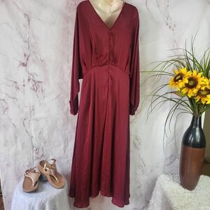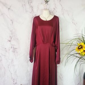 Excellent condition This stunning red gown by Astr features elegant long bishop sleeves and a classic crew neck. Perfect for a wedding guest or cocktail event, its flowing design and sophisticated style make it a standout choice. Zip back