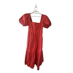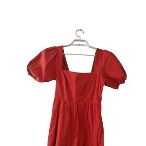Elegant red midi dress with puff sleeves. Square neckline. Perfect for any occasion.