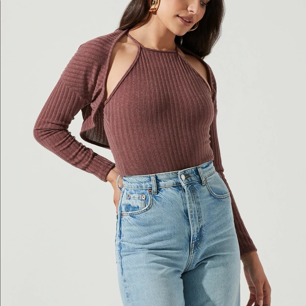 Stylish ribbed bodysuit. Halter neck design. Long sleeves. Perfect for layering.