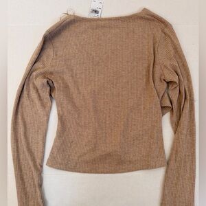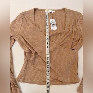 ASTR The Label Crisscross Wrap Surplice V-Neck Sweater. This stylish, ribbed, long-sleeve top in a sand color is designed with a flattering faux-wrap front.