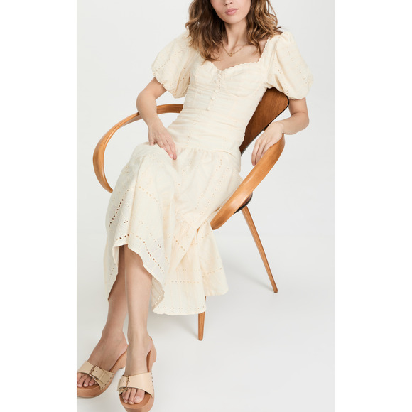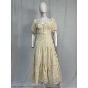 Astr The Label 'Baldwin' Cream Cotton Dress Size S: lightweight, non-stretch eyelet, lace trim at sweetheart neckline, short puff sleeves with elastic cuffs, smocked back, tiered seams and flounce hem, hook-and-eye and hidden zip at side, lined.