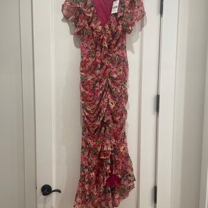 Elegant, playful and fun this beautiful Floral Dress with a flutter sleeve, ruched detailing, midi length with asymmetrical hemline, is perfect for both casual and formal occasions. Zipper enclosure, polyester material, NEVER WORN