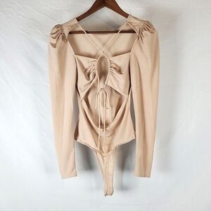 Astr The Label tan ribbed body suit. Crisscross lace up back. Puffed sleeves. Thong bottom. Excellent condition. Size medium.