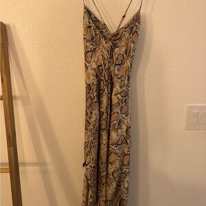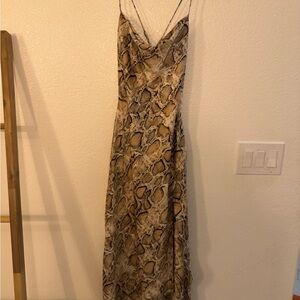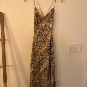 Chic snake print midi dress with a flattering silhouette. Features a stylish side slit. Ideal for versatile styling.