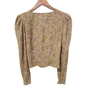 Astr The Label Twist Front Mustard Floral Top. Size S / Small. Features sweetheart neckline, puff long sleeves, twist front detail, floral print, and hidden side zipper closure. Style AT16915B. 100% Polyester. Excellent pre-owned condition, no flaws.