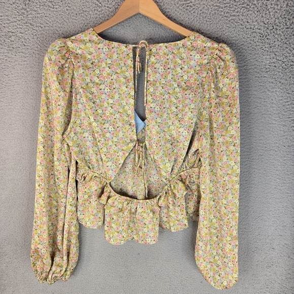 Astr The Label Womens Tie Back Ruffle Cropped Blouse Sz XL Mustard Pink Ditsy