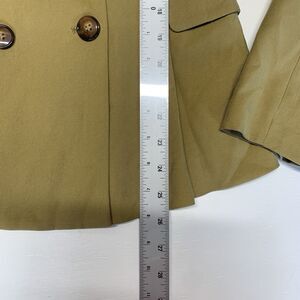 The Astr The Lebel Gold Women's Formal Blazer Jacket in size S is a stylish and elegant outerwear piece made from 100% Worsted Wool. The long sleeve jacket features a front button closure and a soft premium lining, making it perfect for formal occasions such as business meetings, weddings, or everyday events. With a sophisticated gold color and a timeless formal style, this blazer exudes a classy and confident look. Made in the United States, this high-quality garment is designed to be dry cleaned and is sure to add a touch of luxury to any outfit. H 5