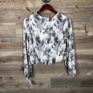 Stylish tie-dye blouse. Features long sleeves and a V-neck. Perfect for casual outings.
