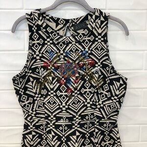 Vivid embroidery plays over the graphic black-and-white print of a curve-hugging dress crafted with a gutsy cutout back.