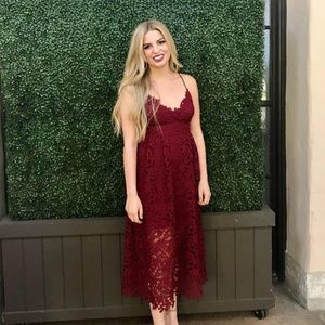 Flatter your figure in this eye-catching closet staple. Whether you dress it up or down the lace overlay plunging neckline and playful A-line silhouette make this midi dress an Influencer fave for its versatility and femininity. Finished with skinny adjustable straps and a hidden zipper back closure.