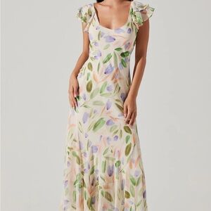 This elegant sundress by Astr features a scoop neckline and flutter cap sleeves, perfect for a wedding guest occasion. The cream base is adorned with a painterly floral print, creating a light and airy aesthetic. Its flowing maxi silhouette adds a touch of sophistication to any event.