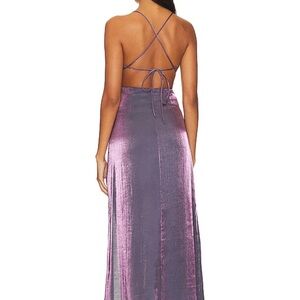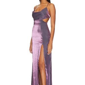 Stunning lavender maxi dress with a sleek silhouette. Features a high slit and shimmering fabric. Ideal for special occasions.