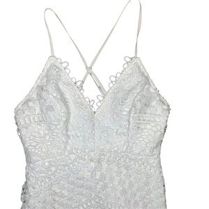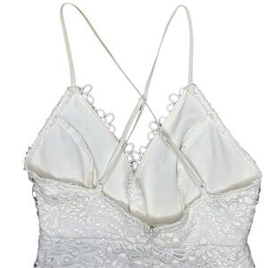 Astr the Label ivory crocheted lace bodycon dress with high-low hemline, back zipper with hook and eye closure and crisscross adjustable spaghetti straps in the back. New condition and gorgeous! Pit to pit 15". Length from underarm 31".