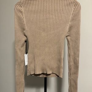The Astr The Label Cortana Sweater in nude features a chic ribbed knit construction with a sweetheart neckline that leads to a cinched bust and cutout detail, with long sleeves. One side of seam coming undone but can be repaired.
