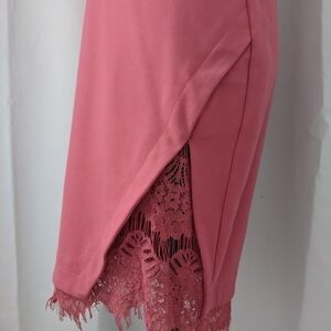 ASTR the label mauve bodycon cocktail dress with loose fringe detail and deep V front. Very form fitting, sexy, thick and study construct for a "suck you in" effect