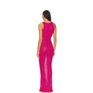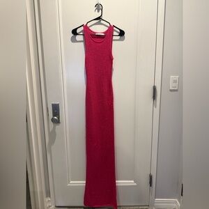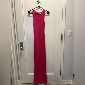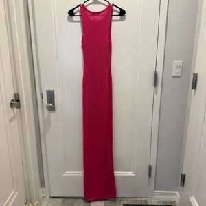 Stunning vibrant pink lace maxi dress. Perfect for elegant occasions.