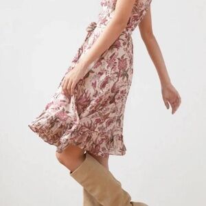 This patterned wrap dress features short sleeves and an A-line silhouette, designed with a chic V-neckline