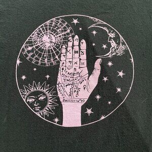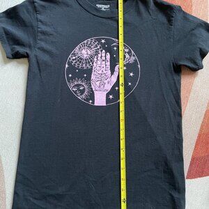 Black tee, short-sleeved, worn a couple of times but GREAT condition. Size XS, but still roomy, not fitted, more of a relaxed fit. LIght Pink graphic with symbolism and whimsical astrological drawings.