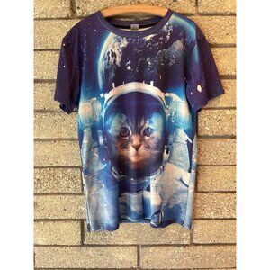 Astronaut Cat Graphic T-Shirt Large Space Galaxy Print Polyester/Spandex Unisex