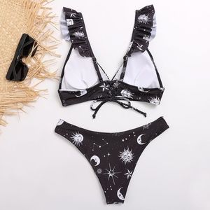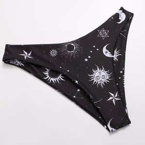 astronomy bikini, astrology swimsuit, celestial print bikini, moon and sun swimsuit, black bikini set, astrology aesthetic, zodiac swimwear, cosmic fashion, pool party bikini, trendy swimsuit