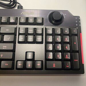 Asus G01 KB black gaming keyboard. Features backlit keys, volume knob, and foldable tilt legs. Wired USB connector. Tested and in working condition. There are some minor scuffs on the back of the keyboard, otherwise in excellent used condition.