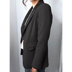 * Description: Front Side Ruffle Detail Pockets, Subtle Black Plaid, Lightweight, Draped Open Front, Notch Lapel Collar, One Button Blazer