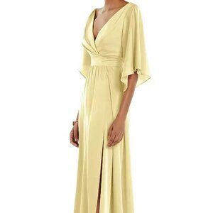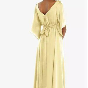Beautiful draping in asymmetric bell sleeves and a surplice neckline lends a soft, ethereal look to this whisper satin, full-length gown. A wide sash at the flexible waist and a softly shirred skirt with a peek-a-boo slit complete the look with elegance. Pockets in skirt. Perfect for your next formal event!