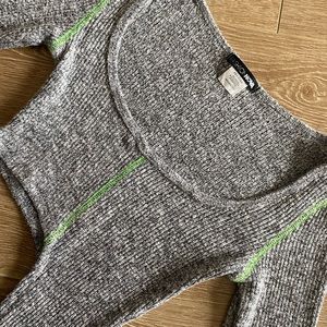 A ribbed knit short sleeve crop top with an asymmetric, elongated hem and contrasting neon green style seams.