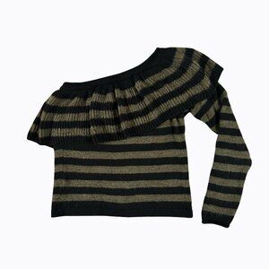 Asymmetric Ruffle One-Shoulder Sweater Sz S Black Olive Striped Y2K 90s Coquette