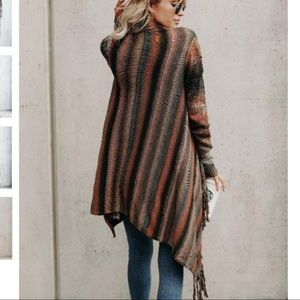NEW warm and cozy long cardigan or light jacket that can be closed and styled in different ways: it has an asymmetric design with a button on each side that enables it. It also has fringes or tassels and draped neckline. Wool Blend material. It can be used by S and M wearers it'll just be a bit loose on folks wearing Small.