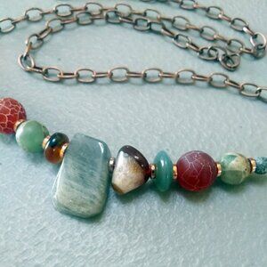 Various green, orange and brown hues. Made with various semi-precious gemstone beads such as Jasper + Agates + finished with a large link copper chain. Necklace measures app 20" - but technically - you can hook the lobster claw clasp into any of the larger links to adjust the overall length.