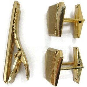 Asymmetrical Cufflinks Tie Clip Set Gold Tone Wedding Tux Vintage