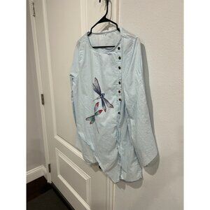 Asymmetrical Hem Dragonfly Embroidery Button-Front Top Sz L Boho Artisan