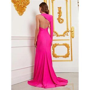 Asymmetrical Neck Floor Length Formal Dress -Color: Hot Pink -Pattern Type: Plain -Type: Bodycon -Details: Asymmetrical, Zipper -Neckline: Asymmetrical Neck -Sleeve Length: Long Sleeve -Sleeve Type: Regular Sleeve -Length: Long -Hem Shaped: Mermaid -Waist Line: High Waist -Fit Type: Slim Fit -Fabric: Medium Stretch -Material: Satin -Composition: 95% Polyester, 5% Elastane -Care Instructions: Hand wash,do not dry clean -Sheer: No