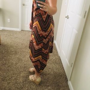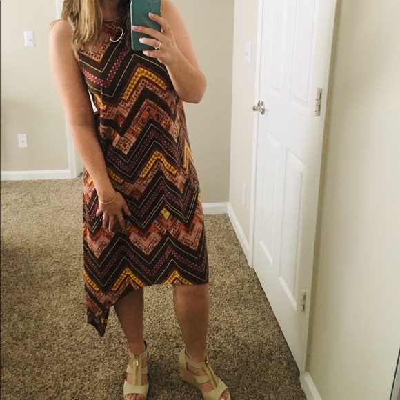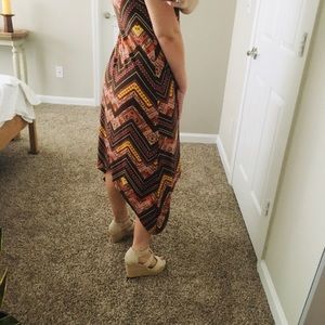 High low dress with ribbed material. High neck. Circle opening right below the neck on the back of the dress (as shown in picture). Also very cute when worn with long sleeve shirt underneath during the fall! In excellent condition! Only worn 2-3 times.