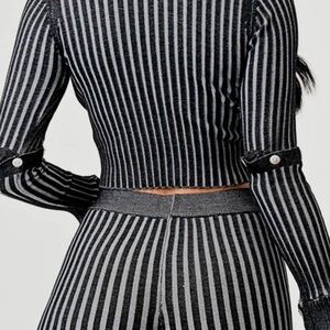 This black and gray ribbed set features a unique, asymmetrical button-up top with a flared, bell-sleeve cuff and statement elbow button details. The top has a striking, uneven hemline for a bold, modern look, paired with ultra-fitted pants that hug your curves. Perfect for standing out with effortless style.