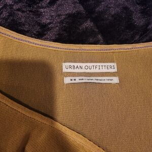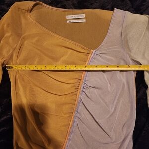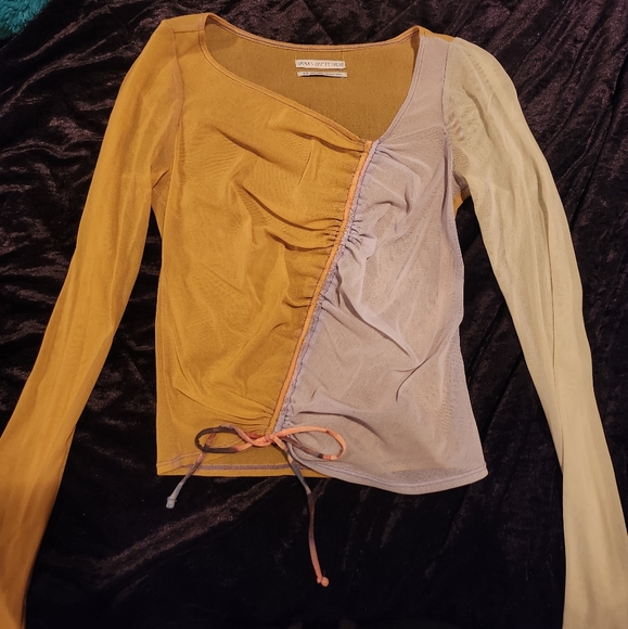 Asymmetrical, ruched front, mesh long sleeve from Urban Outfitters. Marked sized medium, lots of stretch. Can be tightened and shortened with the front tie. Yellow, light blue, mint green. Tie is orangey.