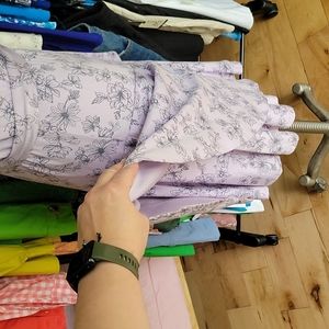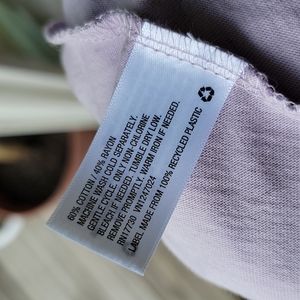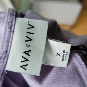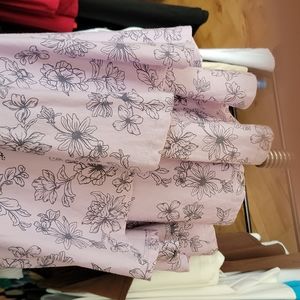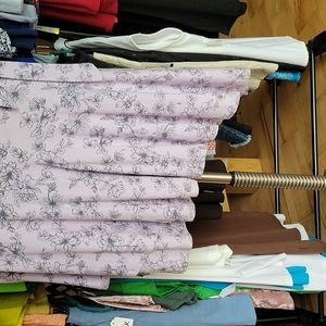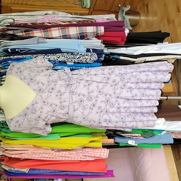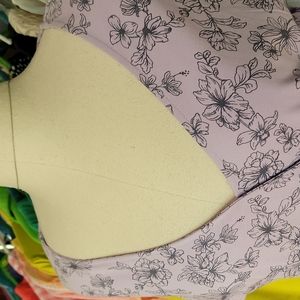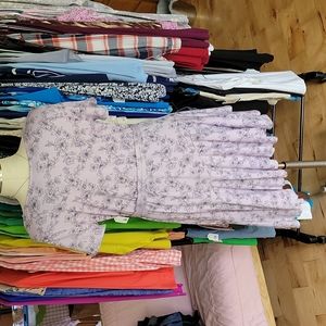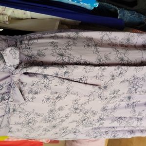Grey floral print on lavender field. Layered ruffles, wrap top and matching fabric belt. Midi length.