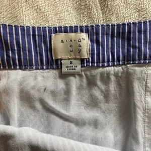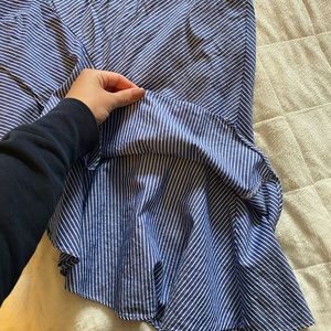 Striped asymmetrical skirt with layered ruffles at the bottom. Hits at the belly button and higher side hits right above my knee. It has great movement and very flirty and fun for spring. Side closure pictured.