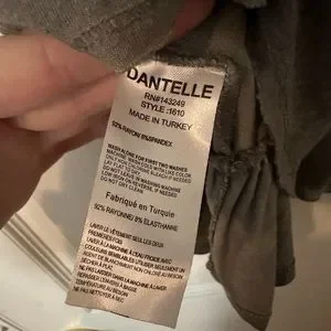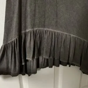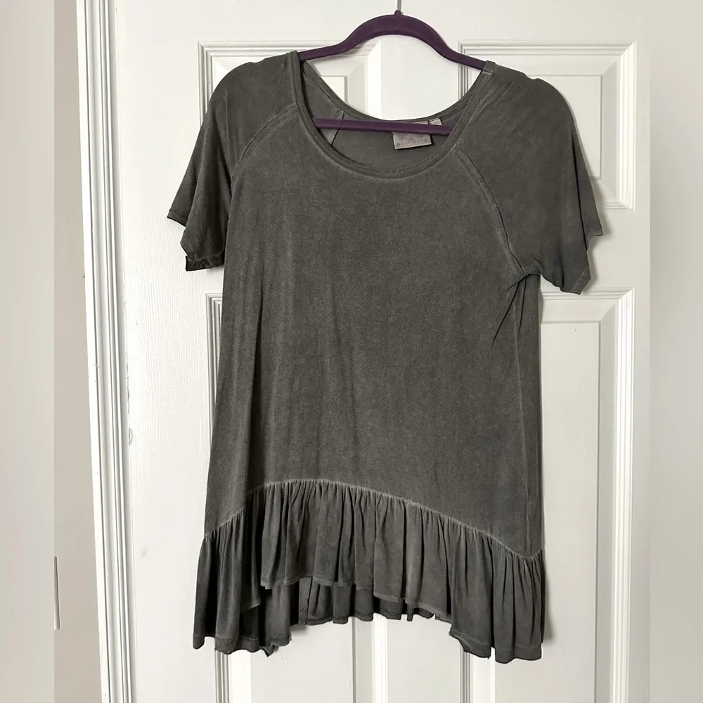 Gray women’s short sleeve shirt with an asymmetrical ruffle bottom. The top is very comfortable but cuter than your average t-shirt!