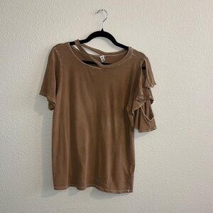 This stylish top features a crew neck design and short sleeves adorned with ruffled details for a unique look. The warm brown and tan colors make it a versatile addition to any wardrobe, perfect for casual outings. The ruffle sleeve has an opening on the same sleeve